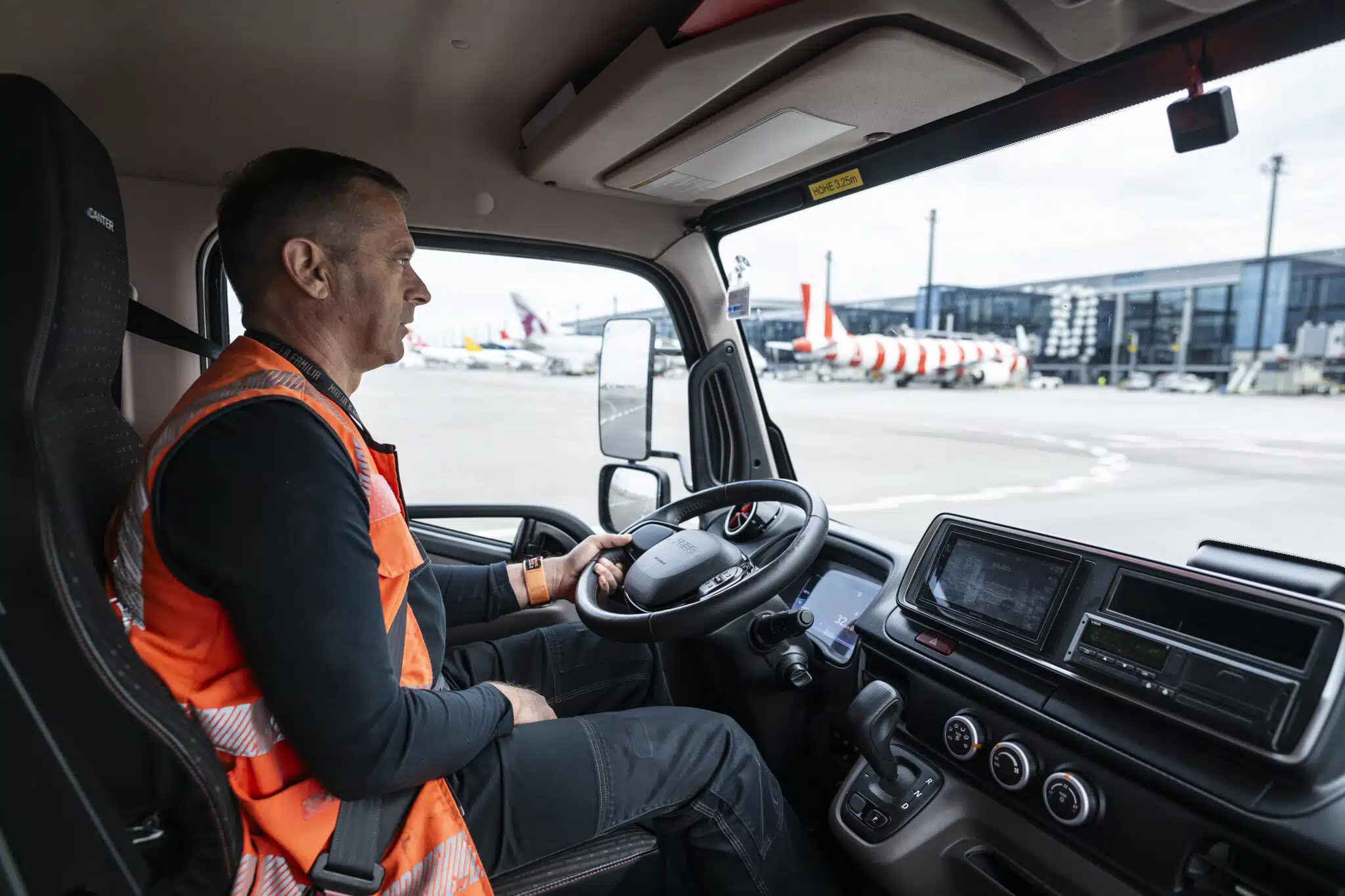 Embora o eCanter seja obviamente exatamente o camião elétrico certo para o trabalho na gestão de resíduos no BER, o trabalho como motorista também tem alguns requisitos específicos. Pois o eCanter não se dirige apenas aos pontos de recolha de resíduos no lado terrestre de acesso público, mas também aos chamados pontos de recolha aéreos atrás do controlo de segurança. Todos os colaboradores que tenham acesso a este local necessitam de uma autorização de segurança completa. Esta verificação de fiabilidade é realizada pela Autoridade de Segurança Aérea e associa informações pessoais de diferentes autoridades, como a polícia, a proteção constitucional e o Serviço Criminal Federal. Quem viaja com um veículo nas estradas de abastecimento do aeródromo, precisa ainda de uma carta de condução de aeroporto especial com aulas teóricas e práticas, incluindo exame. Aliás, é claro que na área de antecipação há um raio.