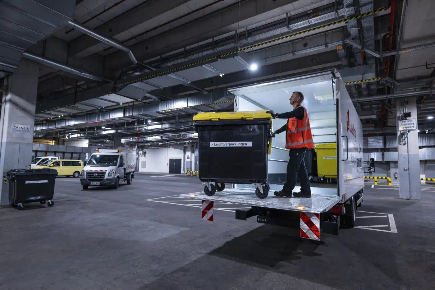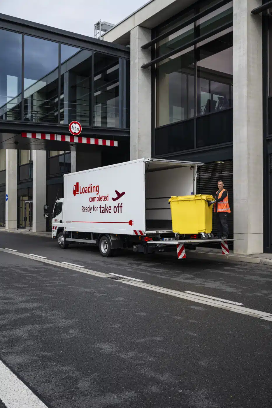 Principalmente, as frações padrão ocorrem. papel, cartão, vidro, embalagens de plástico e resíduos residuais. Também incluem restos de alimentos dos restaurantes e cantinas, resíduos biodegradáveis, mas também coisas como trituradores de documentos dos escritórios, sucata, lixo volumoso e muito mais. Por exemplo, latas de aerossol ou baterias recarregáveis e outros, cuja viagem já termina no controlo da bagagem de mão. Recipientes especiais com resíduos perigosos, como óleo usado ou resíduos recolhidos da limpeza de turbinas de aeronaves, também estão na lista e os pedidos especiais vêm frequentemente das alfândegas. “Quando confissavam algo que não podia ser importado, plantas exóticas, sementes, produtos animais, levamo-los diretamente para uma instalação de eliminação externa correspondente na região de Berlim”, explica Artur Heldt e acrescenta: “por isso, optámos pelo pacote de baterias M com duas baterias e até 140 quilómetros de autonomia para o eCanter, apesar de, teoricamente, o pacote S ter sido suficiente para nós. Mas, assim, temos sempre uma reserva para estes casos e, no funcionamento diário, só temos de carregar a cada dois dias.”