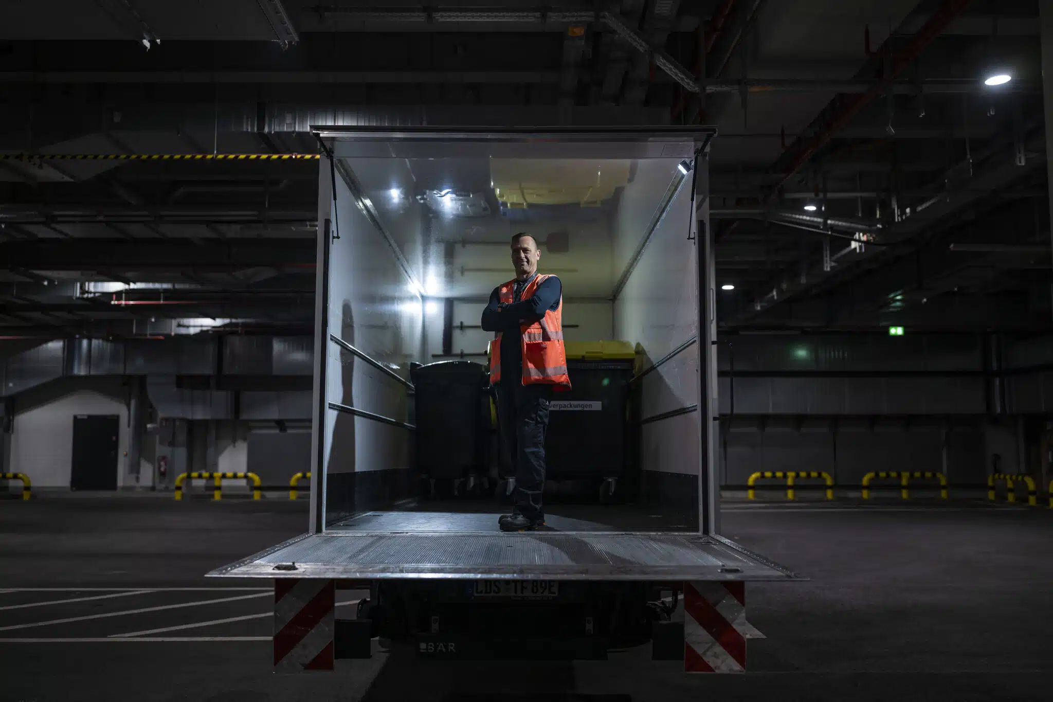 Uma coisa era clara: um veículo a diesel não deveria voltar a ser, pois não são utilizados em trajetos curtos e, por isso, requerem demasiada manutenção. Após uma análise exaustiva, os dados básicos ficaram claros: 7,5 toneladas, autonomia mínima de 70 quilómetros diários, caixa fechada com plataforma elevatória de carga de 1 tonelada, pelo menos 2 toneladas de carga útil plus cerca de 25 metros cúbicos de volume de carga para os mais diversos contentores. “Tenho de confessar que, no início, não tinha a FUSO à vista na pesquisa”, conta o especialista em resíduos, “mas em comparação com outros fornecedores, descobri que, graças às suas muitas possibilidades de configuração, consegui adaptar o eCanter exatamente às nossas necessidades. Isso é simplesmente perfeito.” Entretanto, o eCanter 7C18e circula há um ano e meio nas instalações do aeroporto, já passou por todas as estações do ano e funciona perfeitamente.